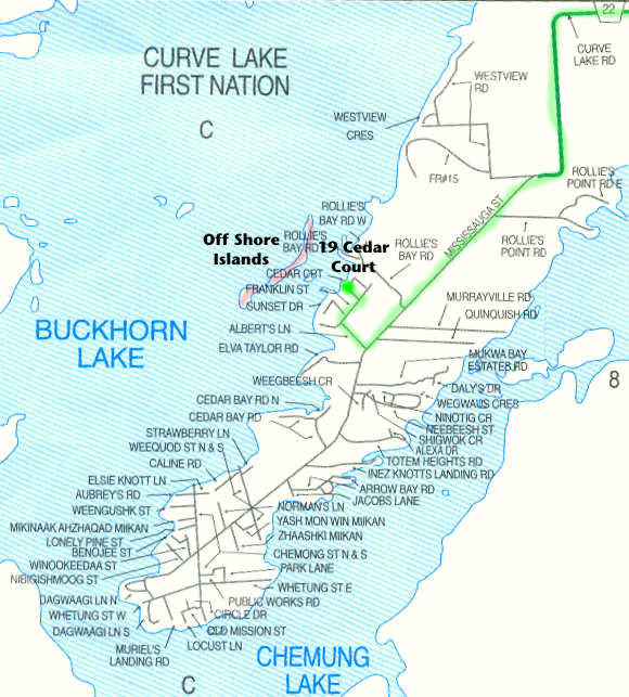 shows you how to get from the main Curve Lake Road to our cottage at 19
