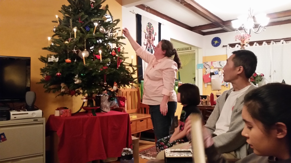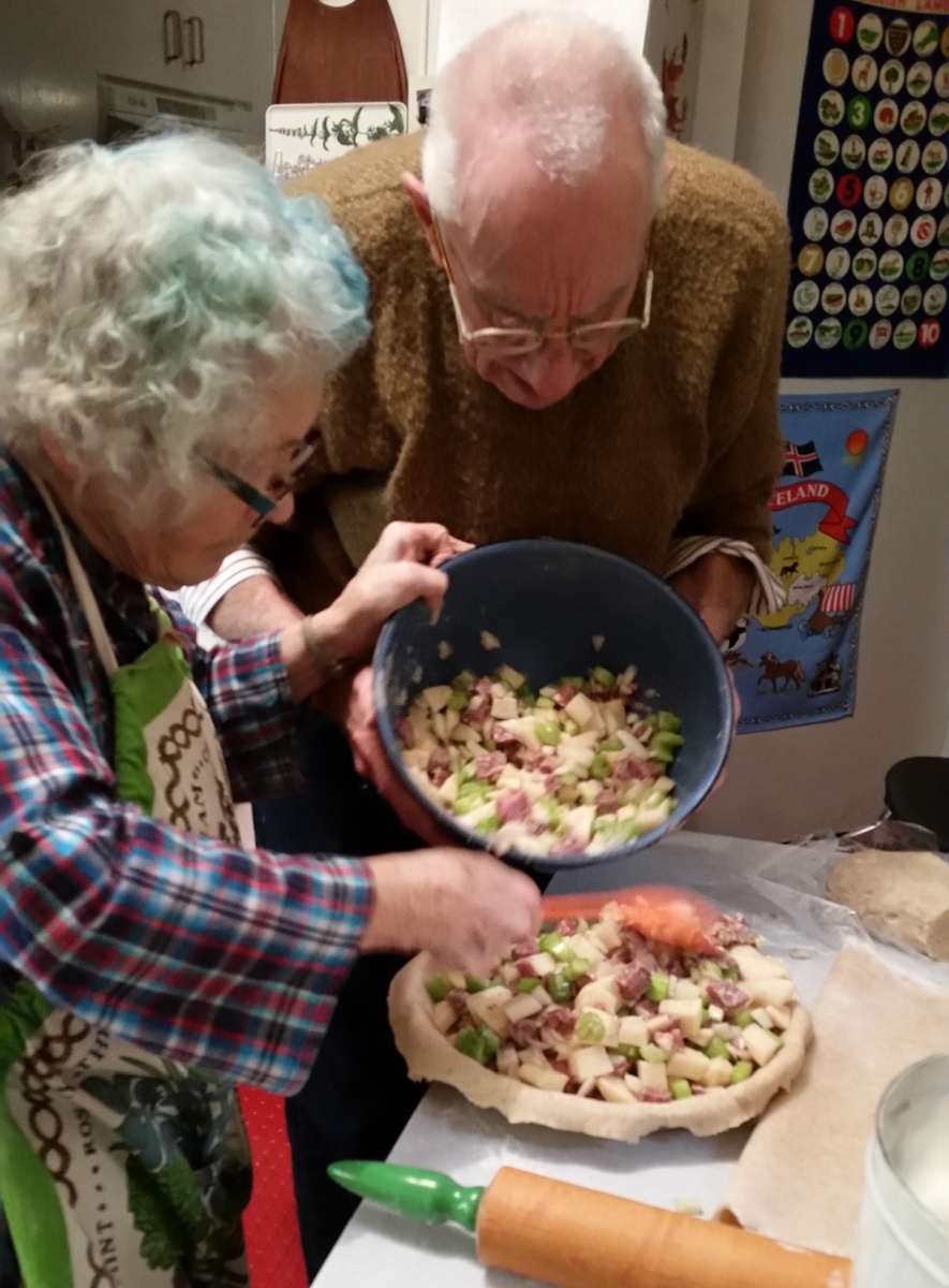 a traditional blessing. This was followed by a Christmas Eve gathering at Cheri Roosen-Runge's daughter's house – Peter Roosen-Runge, Cheri's late husband, was a close friend. (photo on left of Anna, Cheri's daughter lighting a candle on their tree) And then on Christmas Day, we enjoyed Lynn Friesen's famous meat pie, … made following her mother's secret recipe. Jamie, Lynn's husband, and I were colleagues back when we both taught at York University. (photo on right of Lynn and Jamie preparing the famous meat pie)